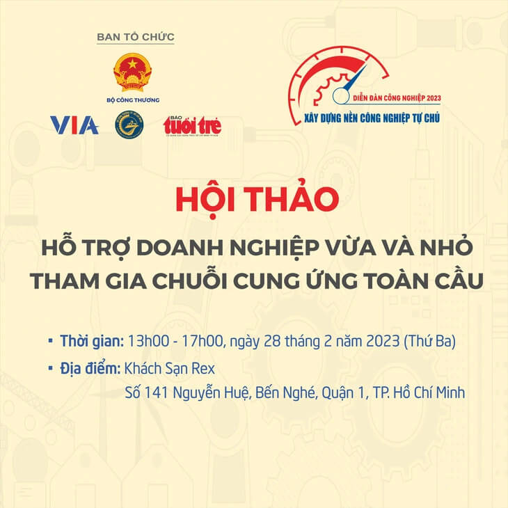 Trong khuôn khổ của Diễn đàn "Xây dựng nền công nghiệp tự chủ", ngày 28-2, báo Tuổi Trẻ cùng Cục Công nghiệp (Bộ Công thương) và Sở Công thương TP.HCM tổ chức hội thảo tại TP.HCM với chủ đề: "Hỗ trợ doanh nghiệp vừa và nhỏ tham gia chuỗi cung ứng toàn cầu".