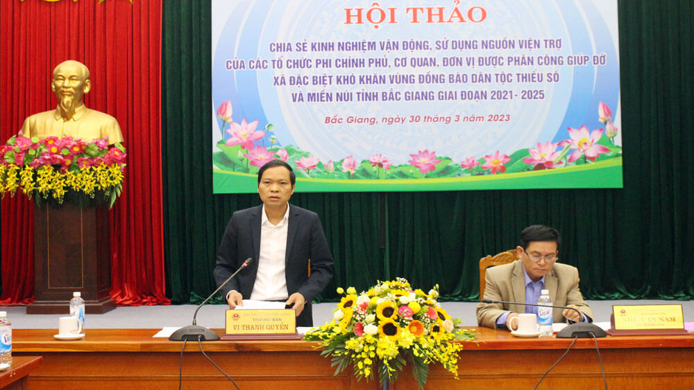 Ngày 30/3, tại Trung tâm Hội nghị tỉnh, Ban Dân tộc tổ chức Hội thảo chia sẻ kinh nghiệm vận động, sử dụng nguồn viện trợ của các tổ chức phi chính phủ, các cơ quan, đơn vị giúp đỡ xã đặc biệt khó khăn vùng đồng bào dân tộc thiểu số và miền núi giai đoạn 2021-2025. Dự Hội thảo có lãnh đạo Ban Dân tộc, đại diện lãnh đạo các sở, ban, ngành của tỉnh; các cơ quan, đơn vị, doanh nghiệp tiêu biểu giúp đỡ các xã đặc biệt khó khăn, lãnh đạo UBND các huyện Sơn Động, Lục Ngạn, Lục Nam, Yên Thế và lãnh đạo UBND các xã đặc biệt khó khăn. Đồng chí Vi Thanh Quyền, Trưởng ban Dân tộc, đồng chí Nhữ Văn Nam, Phó Trưởng ban Dân tộc đồng chủ trì Hội thảo.